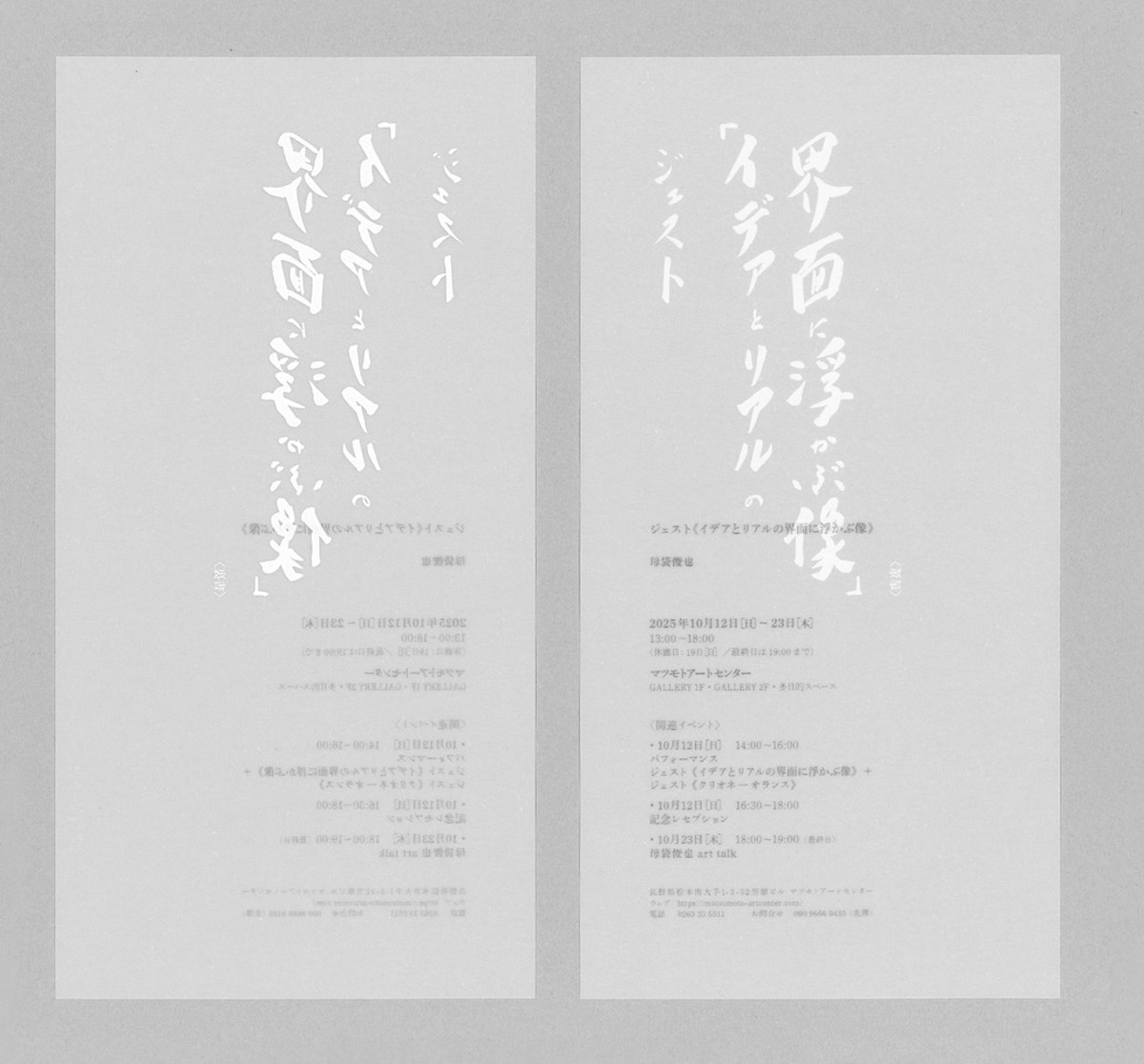 とりわけ、10月12日[日]14:00~16:00パフォーマンス:ジェスト《イデアとリアルの界面に浮かぶ像》+ジェスト《クリオネ― オランス》は、必見です。お近くにお出かけの際は、ぜひお立ち寄りいただき、ご高覧くださいますようご案内申し上げます。