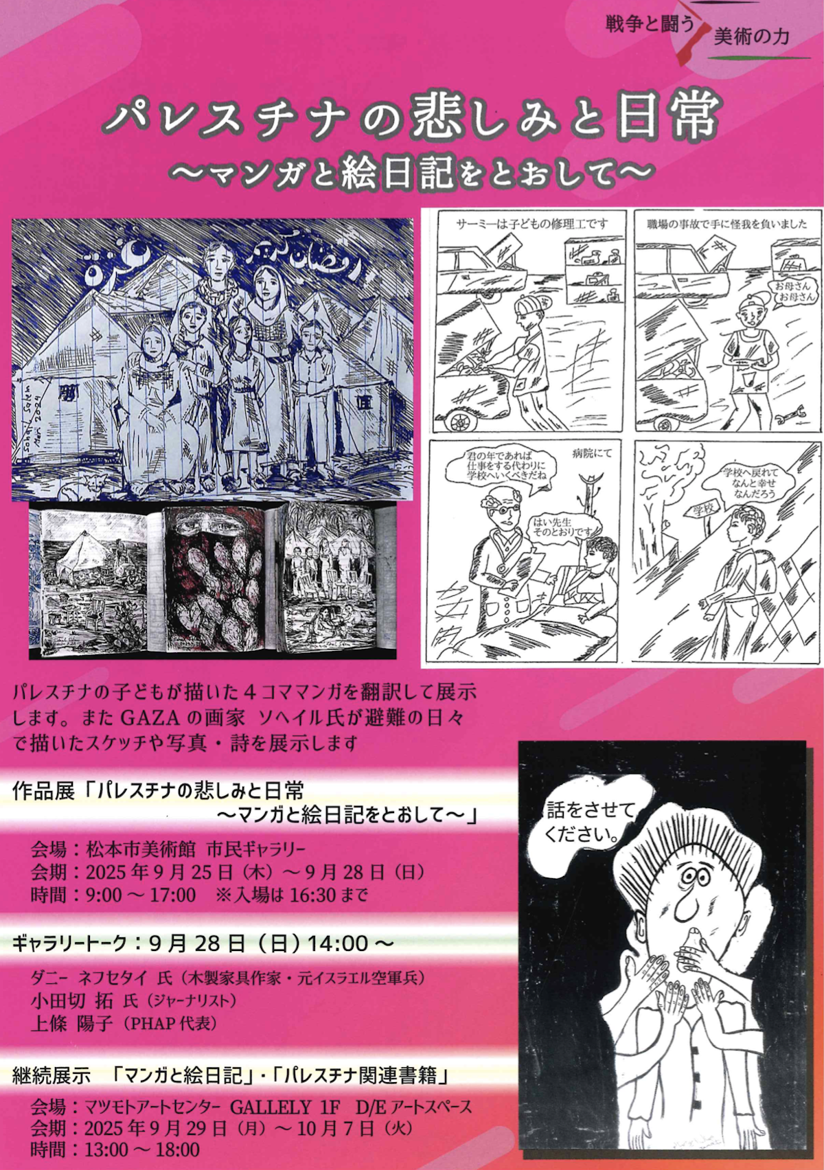 9月25日(木)~9月28日(日)継続展示「マンガと絵日記」と「パレスチナ関連書籍」を展示いたします