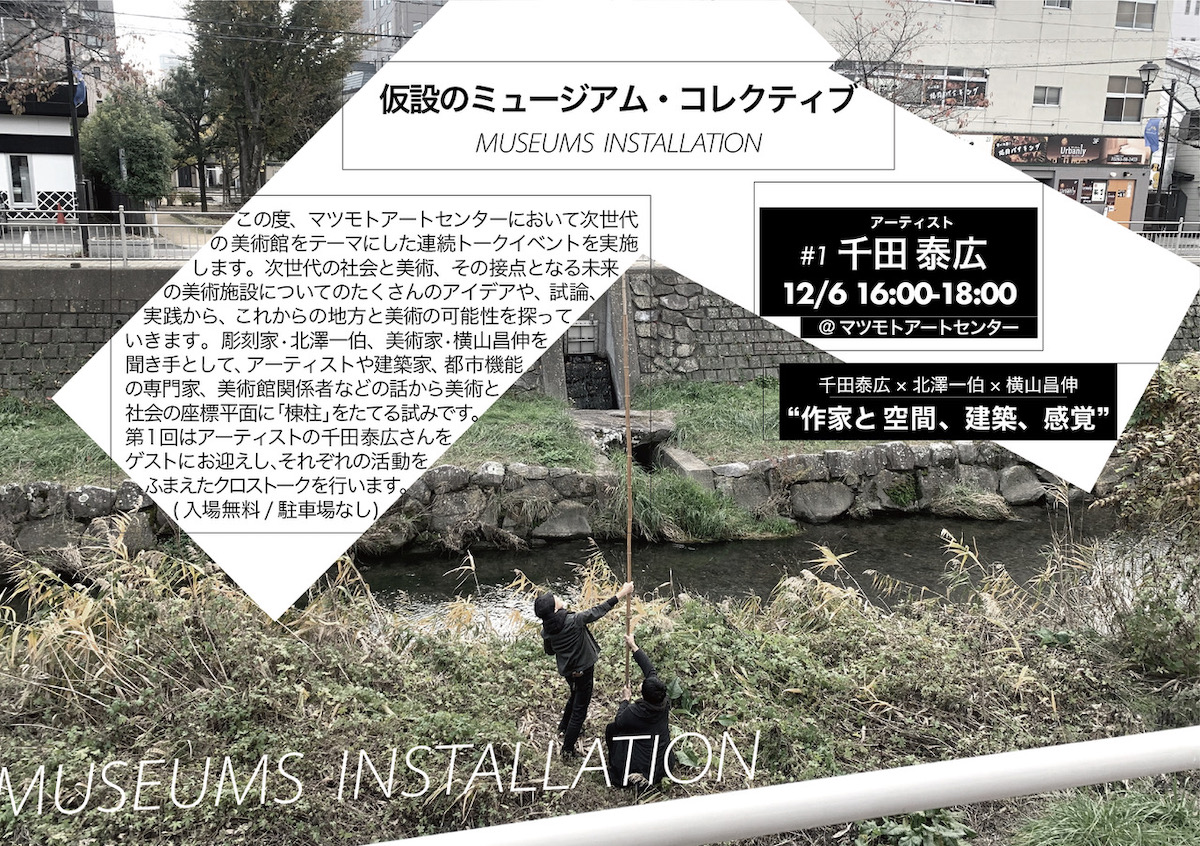 この度、マツモトアートセンターにおいて、次世代の美術館をテーマにした連続トークイベントを実施します。次世代の社会と美術、その接点となる未来の美術施設についてのたくさんのアイデアや、試論、実践からこれからの地方と美術の可能性を探っていきます。彫刻家・北澤一伯、美術家・横山昌伸を聞き手として、アーティストや建築家、都市機能の専門家、美術関係者などの話から美術と社会の座標平面に「棟柱」をたてる試みです。