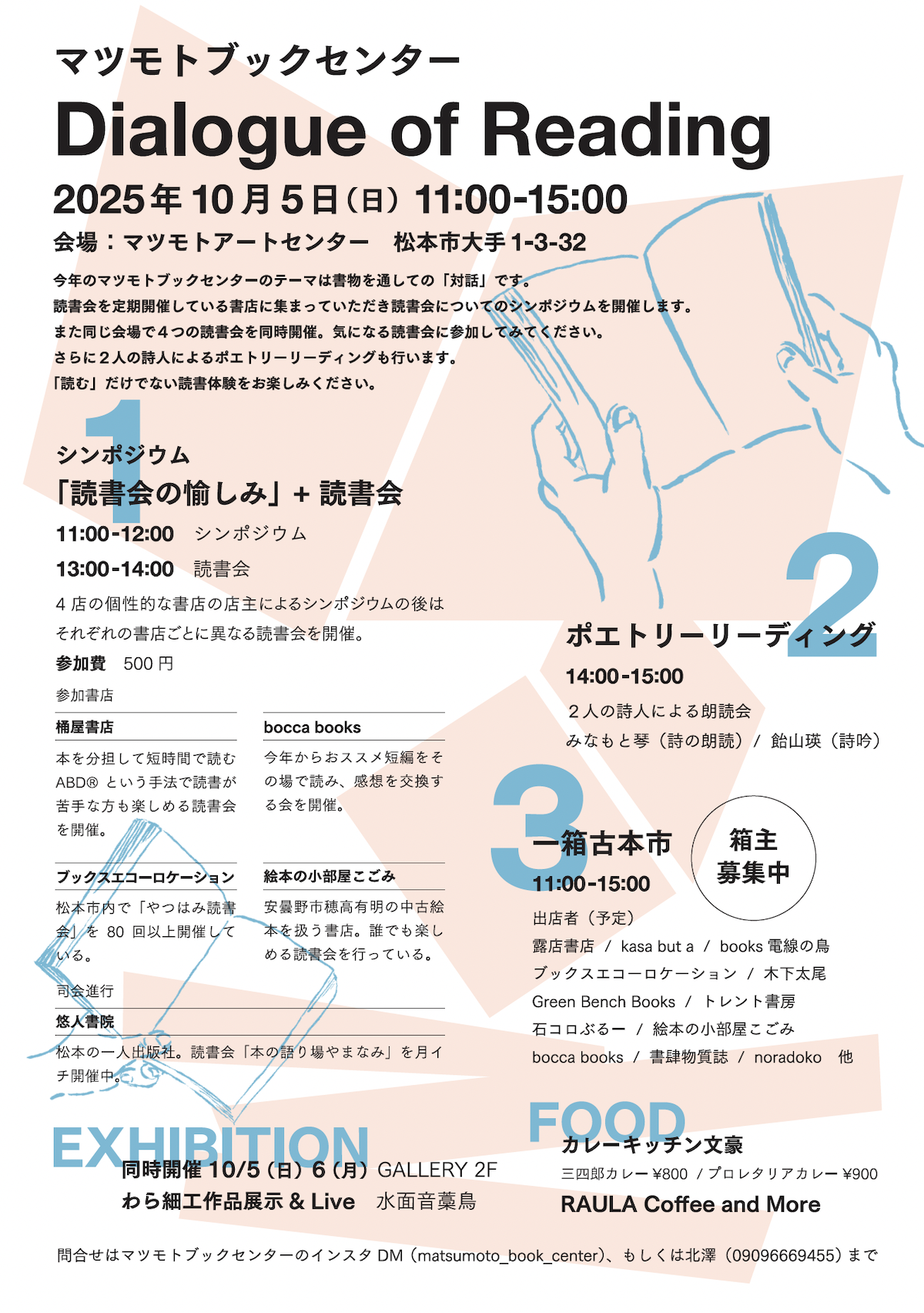 絵本の小部屋こごみ bocca books書肆物質誌 アカンサス書店 books電線の鳥 ブックスエコーロケーション Green Bench Books のらどこnoradoko ハンザキブックス ジブンゴトbooks 露店書房 などによる一箱古本市や自費出版の本のコーナーをつくります